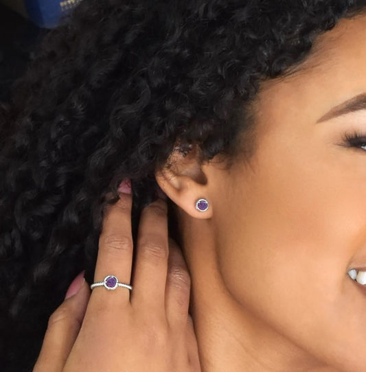 Genuine Amethyst Gemstone Rope Halo Solitaire Stacking Ring in Sterling Silver