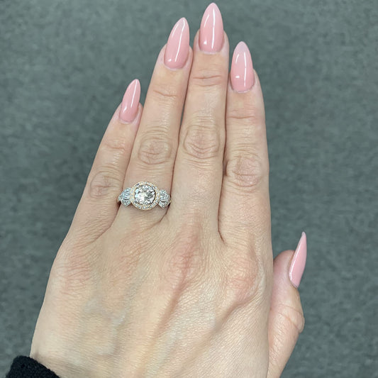 Genuine Morganite & 1/3cttw Diamond Halo Milgrain Floral 10K White & Rose Gold Engagement or Statement Ring