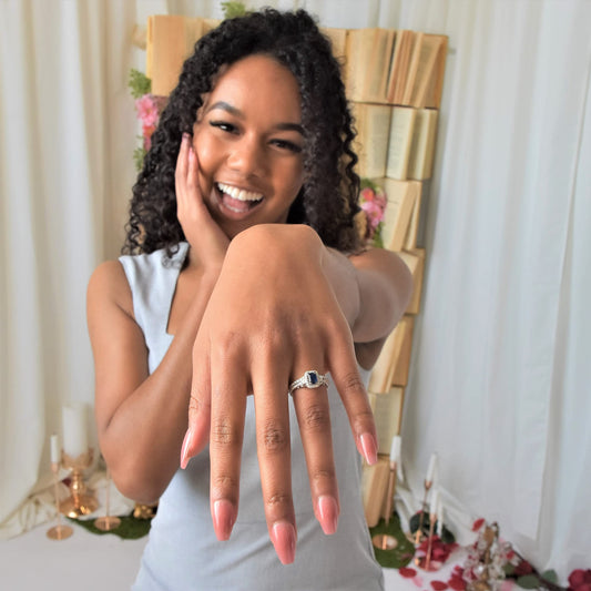 Genuine Emerald Cut Blue Sapphire & 1/4cttw Diamond Vintage Halo 10K White Gold Engagement or Statement Ring