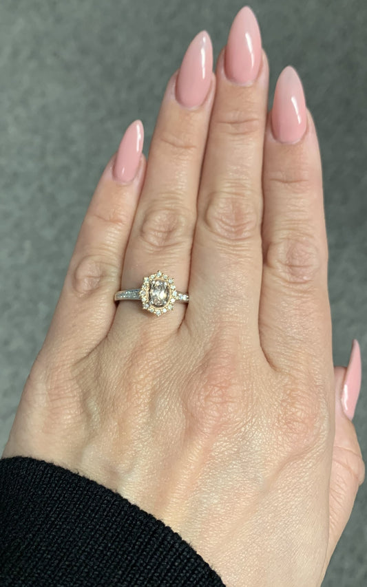 Genuine Oval Morganite & 1/3cttw Diamond Halo Cathedral 10K White & Rose Gold Engagement Ring