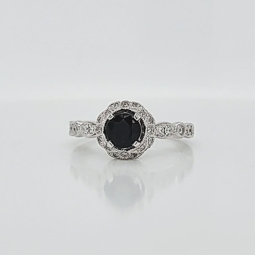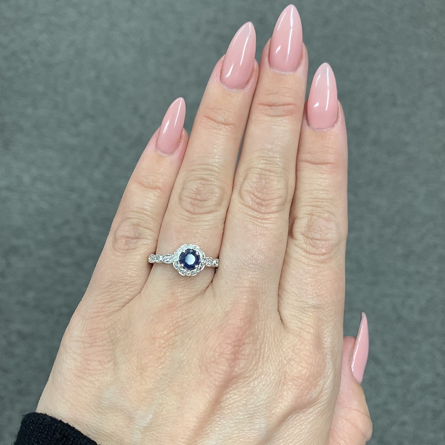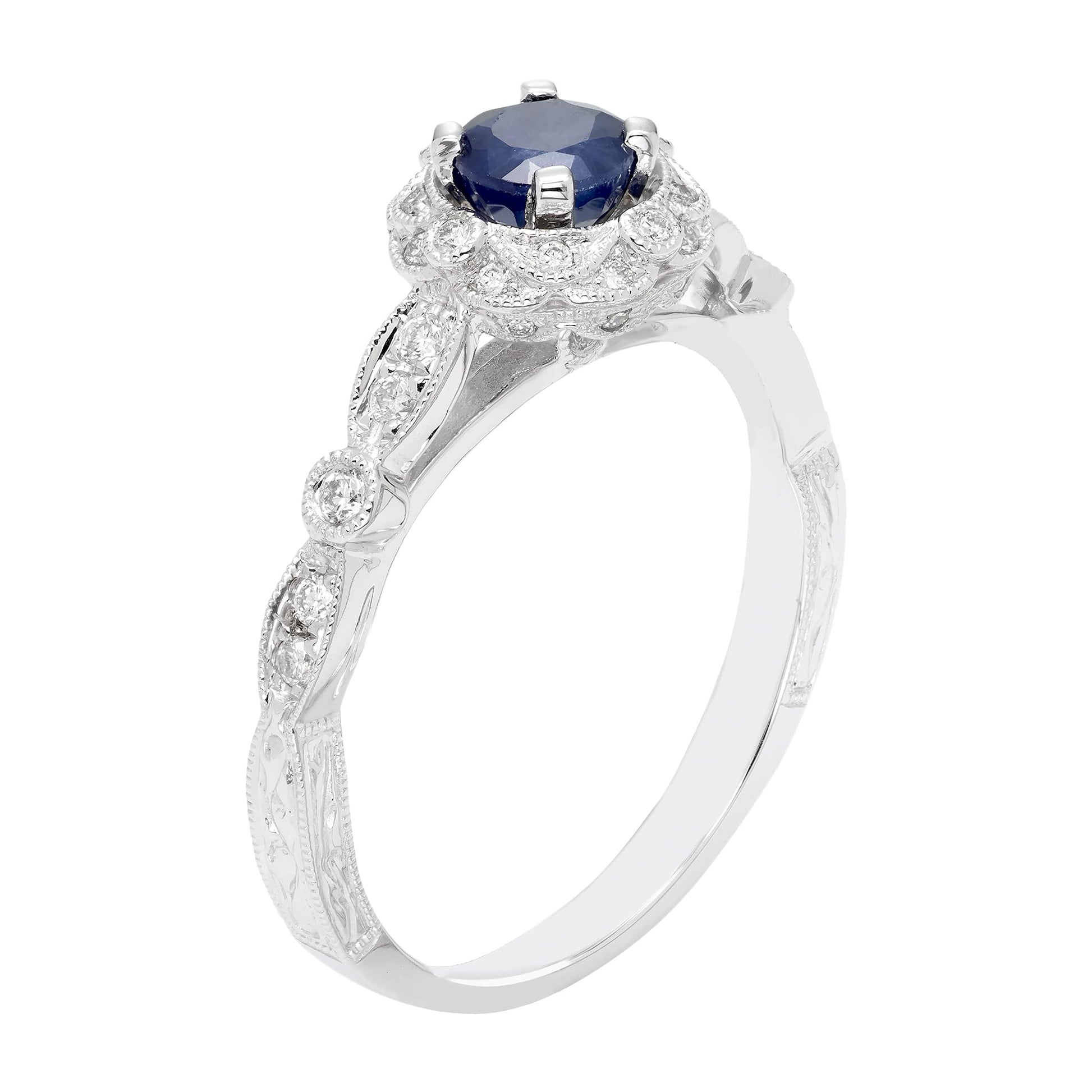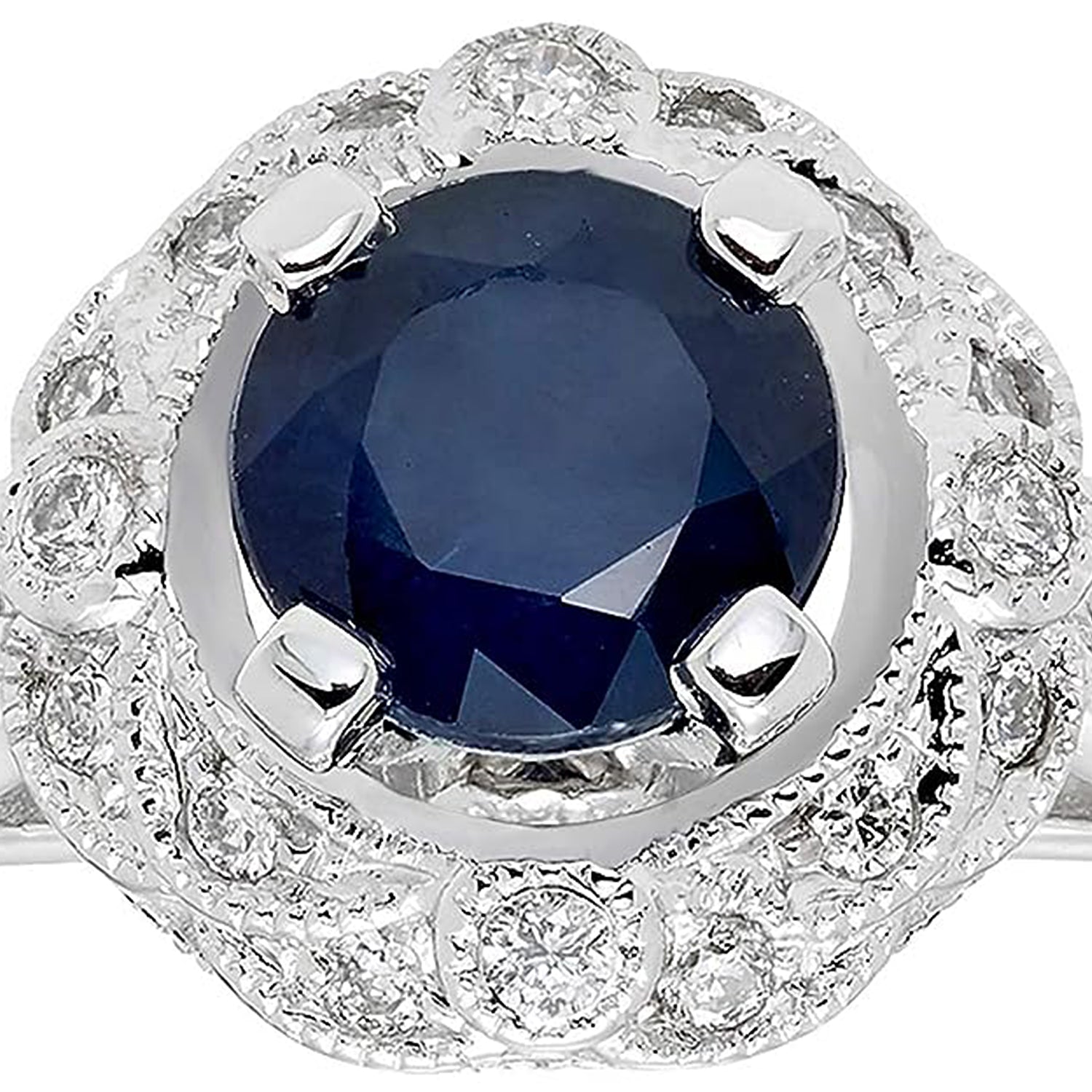 Genuine Blue Sapphire & 1/4cttw Diamond Vintage Milgrain Halo 10K White Gold Engagement or Statement Ring