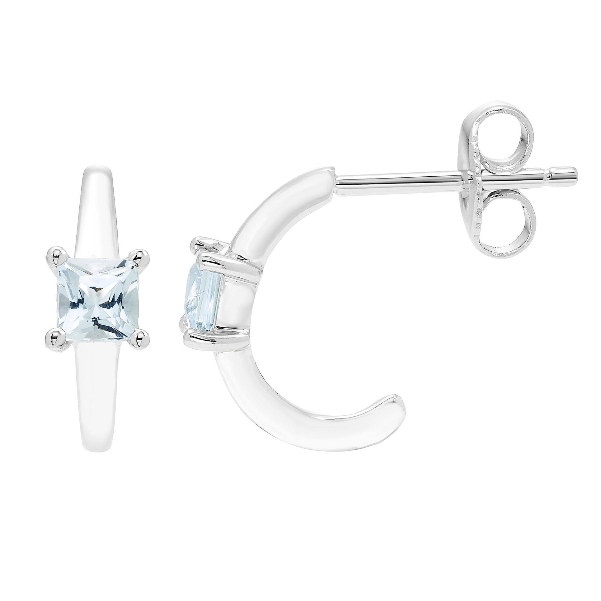 Aquamarine Princess Cut Half Hoop March Birthstone Earrings in .925 Sterling Silver